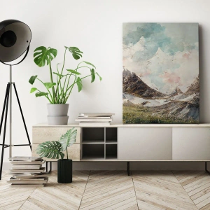 - Målningen avbildar ett pittoreskt bergslandskap med en pastellfärgad himmel. De fantastiska topparna, i harmoni med de fina färgerna, skapar det perfekta motivet för interiörer fyllda av lugn och inspiration.