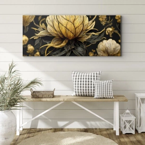 - Den gyllene blomman mot en mörk bakgrund skapar en sofistikerad och uppmärksamhetsfångande komposition som fungerar perfekt som ett dekorativt element i eleganta interiörer, såsom ett vardagsrum eller sovrum. Verket utmärker sig med sin lyxiga karaktär...