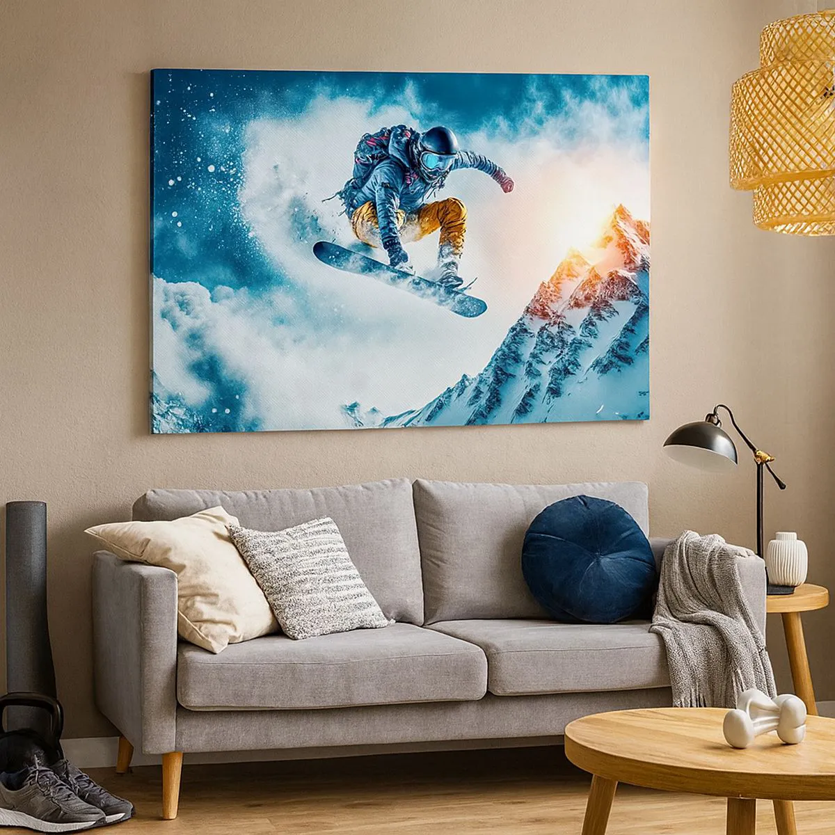 • Denna målning föreställer en snowboardåkare som svävar över snötäckta berg, fångad i ett dynamiskt ögonblick. Det är den perfekta dekorationen för fans av extremsporter och vinterlandskap.