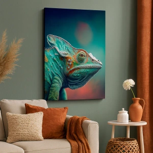 - En canvastavla som föreställer en kameleont i livfullt grönt och orange. En slående och exotisk komposition, perfekt för moderna inredningar.