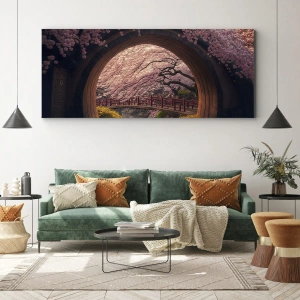 Målningen skapades på högkvalitativ duk, vilket garanterar hållbarhet och exceptionellt färgdjup. Detaljerna i körsbärsblommorna, delikata nyanser av rosa och grönt, och brons karakteristiska arkitektur ger verket en unik charm. Färgernas harmoni och subtiliteten i kompositionen skapar en fridfull atmosfär i interiören.