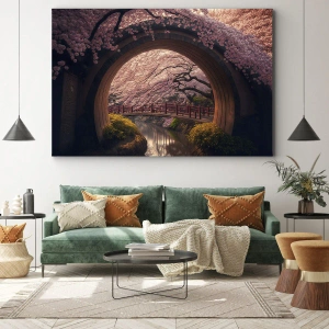 - En målning som föreställer en vacker japansk bro omgiven av körsbärsblommor, vilket ger elegans och harmoni till interiörer, perfekt som dekoration i asiatisk stil.