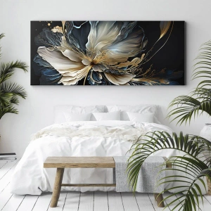- Denna canvastavla på 70x50 cm avbildar en blomma i nyanser av guld och marinblått mot en svart bakgrund. Ett elegant tillskott till moderna inredningar.