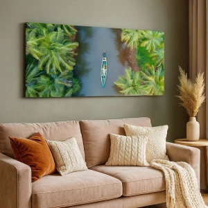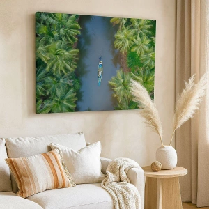 Canvastavla - Bild på duk - En fågelperspektiv av en båt på en flod omgiven av palmer - 70x50cm - På en tropisk stig - Modern väggdekoration för vardagsrum och sovrum ARTTOR