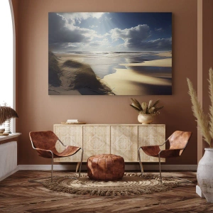 • Målningen föreställer en vild strand med sanddyner och en blå himmel, omgiven av naturlig skönhet. Det är ett idealiskt val för dem som värdesätter lugn och ett harmoniskt landskap.