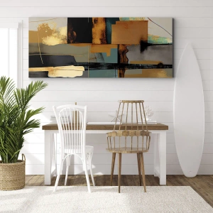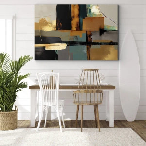 Målningen skapades på högkvalitativ duk som mäter 70x50 cm i ett horisontellt format. Dess universella form gör den perfekt lämpad för en mängd olika utrymmen – från vardagsrum, via arbetsrum till moderna kontor. Färgschemat baserat på guld och turkos ger interiören elegans samtidigt som det inspirerar till kreativt tänkande.