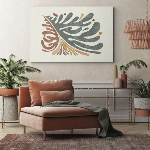 - En modern målning med ett abstrakt löv i jordnära toner mot en ljus bakgrund. Perfekt för inredningar som värdesätter harmoni och modern design.