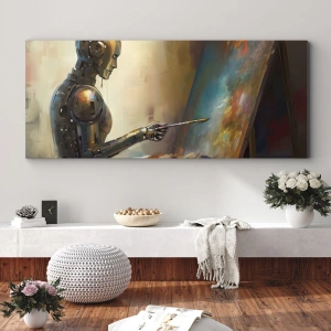 "Framtidens konst" är en unik canvastavla som kombinerar modern estetik med konstnärlig kreativitet. Den avbildar en robotmålning på duk, vilket ger en harmonisk blandning av teknologi och konst till interiören.