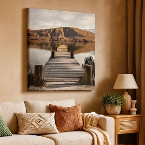 - En träpir med utsikt över en sjö omgiven av pittoreska kullar. En perfekt dekoration för att ge lugn och naturlig skönhet till vilken inredning som helst.
