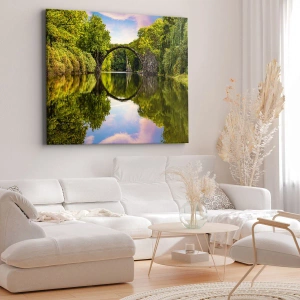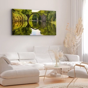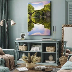 Canvastavla - Bild på duk - En stenbro över en flod med en perfekt reflektion i vattnet - 70x50cm - På skarven mellan två världar - Modern väggdekoration för vardagsrum och sovrum ARTTOR