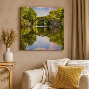- Målningen föreställer en pittoresk stenbro över en flod, perfekt reflekterad i vattnet, omgiven av frodig grönska, vilket skapar ett landskap av harmoni och lugn. Ett idealiskt val för naturinspirerade interiörer.