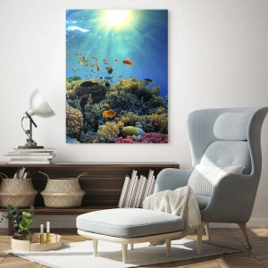 Denna undervattensscen har fångats på ett unikt sätt – havets djup visas ur perspektivet av ljuset som kommer in från ytan, vilket ger målningen inte bara realism utan också en känslomässig dimension. Koraller skimrar i nyanser av rött, orange, gult, grönt och blått, vilket skapar en komposition som fångar ögat och stimulerar fantasin. Fiskar i intensiva färger ger dynamik och rör sig fritt bland naturliga former.