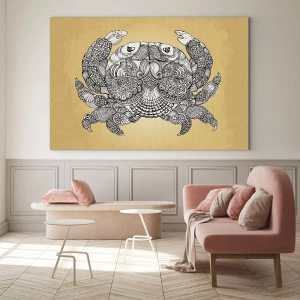 Glastavla - Bild på glas - Stiliserad teckning av en krabba med ornament på gul bakgrund - 70x50cm - Herr Krabba berättar - Modern väggdekoration för vardagsrum och sovrum ARTTOR
