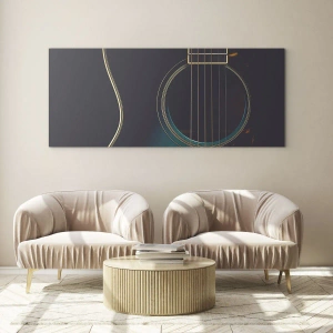 Gitarrmotivet är inte bara en symbol för musik, utan också känslor och passion. Närbilden avslöjar träets struktur, de metalliska strängarna och formens rundhet, vilket ger hela verket realism och djup. Detta är ett idealiskt förslag för musikälskare som vill ge sitt utrymme en konstnärlig touch.