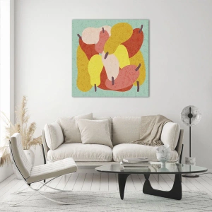 Glastavla - Bild på glas - Färgglada päron i grafisk stil mot turkos bakgrund - 70x50cm - Smaka på sommarsolen - Modern väggdekoration för vardagsrum och sovrum ARTTOR