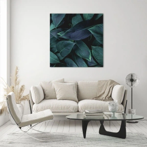 "Täta gröna blad på en mörk bakgrund" är ett förslag för dem som söker en balans mellan natur och modern design. Den kommer att se perfekt ut i ett vardagsrum, sovrum, kontor eller till och med ett relaxområde. **Glastryck** med **växtmotiv** är ett val som ger fräschör och tidlös estetik till alla arrangemang.