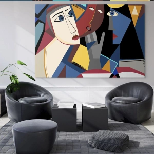 I förgrunden syns två stiliserade, kubistiska figurer, var och en visad från ett annat perspektiv, vilket förstärker intrycket av djup och dialog. Kubistiska ansiktsdrag, förenklade konturer och lek med form skapar en konstnärlig värld full av symboler och känslor. Detta motiv drar till sig uppmärksamhet och tvingar fram reflektion över relationerna mellan karaktärerna och deras inre upplevelser.
