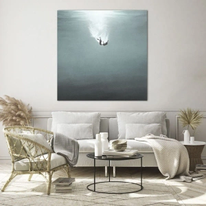 Glastavla - Bild på glas - Silhuetten av en man nedsänkt i havets blå djup - 70x50cm - I havets famn - Modern väggdekoration för vardagsrum och sovrum ARTTOR