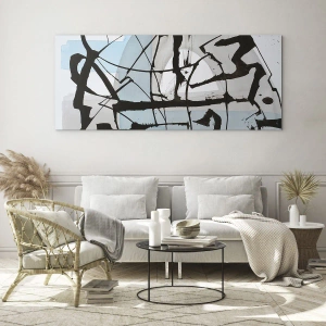 Glastavla - Bild på glas - Abstrakt komposition med en svart skiss och blå fläckar - 70x50cm - Blått trots allt - Modern väggdekoration för vardagsrum och sovrum ARTTOR