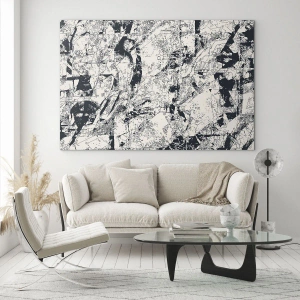 Kompositionen drar till sig ögat tack vare sammansättningen av geometriska former och dynamiska linjer. Den tydliga kontrasten mellan svart och vitt skapar spänning, vilket ger målningen energi. Denna form av dekoration är perfekt för interiörer som domineras av enkelhet och modern design. Den är det perfekta komplementet till minimalistiska, industriella eller loftutrymmen.