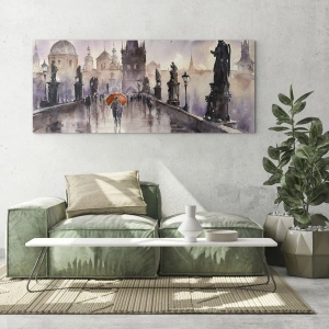 De karakteristiska silhuetterna av byggnaderna och statyerna på bron ger monumentalitet och konstnärligt djup, medan reflektionerna på den våta ytan skapar en effekt av flyt och rörelse. Målningen fångar perfekt atmosfären av regn – ett ögonblick av reflektion, närhet och romantik. Detta gör denna vardagsrumsmålning perfekt för att inreda utrymmen utformade för att främja lugn och atmosfär.