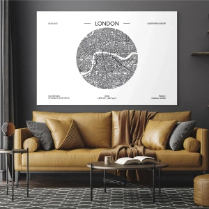 Målningen Londons anatomi är en detaljerad karta över den brittiska huvudstaden, presenterad i en elegant svartvit grafisk stil. Kompositionen kombinerar estetik, precision och minimalistisk stil, vilket skapar en sofistikerad dekorativ accent.