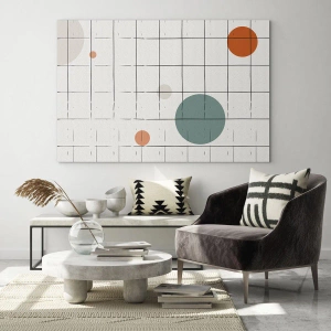 Glasbild "Fångad. Vi eller Dem?" är en spännande grafisk komposition där ett tunt, geometriskt rutnät skapar en ram för färgglada, varierat arrangerade cirklar. Verket kännetecknas av exceptionell enkelhet och ett subtilt spel av geometriska former. Bakgrunden, i en ljus beige nyans, är en perfekt bas för pastellfärger och mättade färger, som djupgrönt, orange eller subtilt beige.