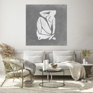 Glastavla - Bild på glas - En minimalistisk silhuett av en kvinna mot en grå bakgrund - 70x50cm - I drömmarnas värld - Modern väggdekoration för vardagsrum och sovrum ARTTOR