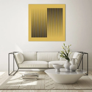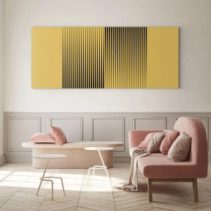 - En abstrakt komposition av svarta, vertikala linjer som skapar en visuell illusion mot en gul bakgrund. Dess minimalistiska form och geometriska layout gör målningen idealisk för moderna utrymmen.