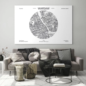 Målningen med titeln "Warszawas anatomi" är ett unikt förslag för älskare av modern design och minimalism. Illustrationen presenterar en detaljerad karta över Warszawa i form av en svartvit grafisk komposition. Den centrala platsen intas av utformningen av gator, broar och byggnader, visade i en cirkulär ram, vilket ger harmoni och estetik till helheten. Målningen sticker ut med sin exakt återgivna stadskarta, som presenteras i en minimalistisk, geometrisk stil.