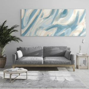 Denna abstrakta uttrycksform lämnar brett utrymme för individuell tolkning. Pastellfärgerna, dominansen av blått och lättheten i former ger målningen en lugnande effekt och främjar avkoppling. Penseldragen skapar effekten av krusande tyg eller moln, vilket ger djup och rymd till kompositionen. Målningen är ett utmärkt dekorativt element för både hem och arbetsutrymmen, där harmonin mellan färger och väggdekoration skapar en atmosfär av komfort och inspiration.