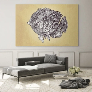 Glastavla - Bild på glas - En tecknad fisk med ornament på en beige bakgrund - 70x50cm - Från ett hav av ornament - Modern väggdekoration för vardagsrum och sovrum ARTTOR