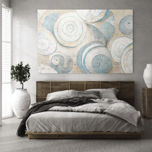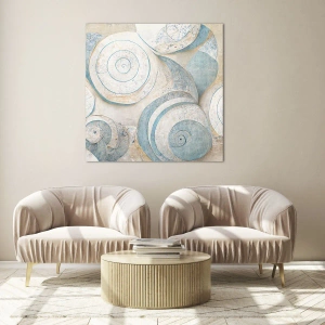 - Målningen avbildar ett flertal spiralformade snäckor i nyanser av blått och beige. Inspirerad av naturen ger kompositionen lugn och harmoni till interiören och gläds med sin textur och subtila färger.