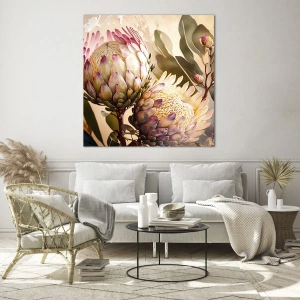 Blommotiv fortsätter att åtnjuta orubblig popularitet bland glastryck. "Tenderly Embraced" är ett utmärkt blomtryck för ett vardagsrum eller sovrum. Denna väggdekoration av protea glädjer inte bara med sin form utan även med sin symbolik. Blommor presenterade i varma toner ger tröst och inspiration. Dessa varma färger ger en mysig känsla till alla interiörer, vilket gör dem mer personliga och välkomnande.