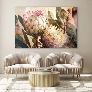 Målningens konstnärliga utförande gläds med sina detaljer – lager av kronblad, bladens struktur, realistisk chiaroscuro. Allt detta gör att scenen verkar nästan tredimensionell. Färgkompositionen, baserad på rosa, grönt, benvitt och bärnstensfärgade toner, skapar en harmonisk helhet som lugnar sinnena. Protea har fångats i olika blomningsstadier, vilket ger bilden dynamik och djup.