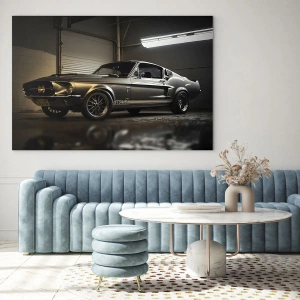 Denna glasmålning är en elegant väggdekoration som passar in i andan av samtida konst. Avbildningen av en bil i ett stämningsfullt garage är inte bara en visuell njutning, utan också ett uttryck för nostalgi, passion och klassisk skönhet.