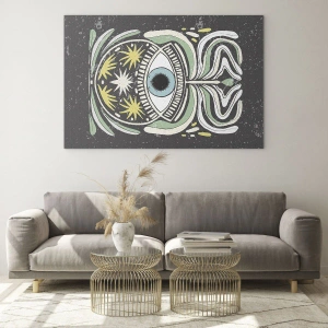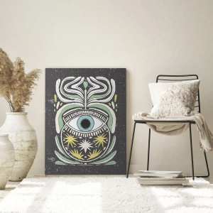 - En konstnärlig komposition med en central ögonsymbol omgiven av etniska mönster mot svart bakgrund. Dess starka grafiska form och mystiska karaktär skapar en modern och uttrycksfull inredning.