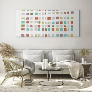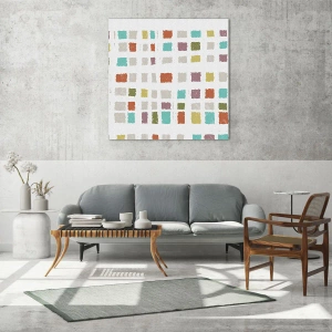 - En abstrakt komposition bestående av flerfärgade rutor som skapar en rytmisk mosaik mot en vit bakgrund. En lätt och kreativ dekoration för moderna och minimalistiska interiörer.