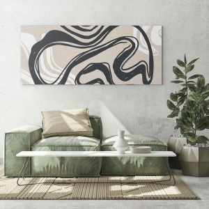 - En modern abstraktion med en dynamisk svart linje mot en beige bakgrund. En rytmisk och fritt flödande komposition i minimalistisk stil med en touch av uttryck.