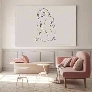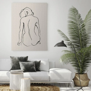 - Målningen avbildar en subtil, linjär skiss av en sittande kvinna mot en ljus bakgrund. En minimalistisk form av en kvinnlig nakenfigur, perfekt för moderna och konstnärliga interiörer.
