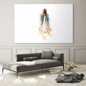 - Målningen avbildar en rymdfärja som lyfter i akvarellstil mot en vit bakgrund. En dynamisk och inspirerande komposition, perfekt för moderna och ungdomliga interiörer.