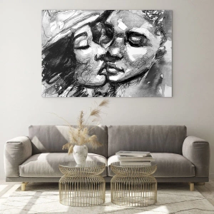 Glastavla - Bild på glas - Svartvit skiss av en öm kyss - 70x50cm - Ett ömt ögonblick - Modern väggdekoration för vardagsrum och sovrum ARTTOR