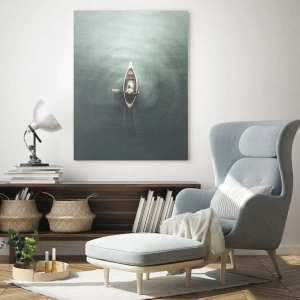 - En delikat scen av en ensam båt på en lugn, grönaktig sjö. Den minimalistiska kompositionen fängslar med sin harmoni och lugn, och skapar en symbolisk skildring av ensamhet och inre frid.
