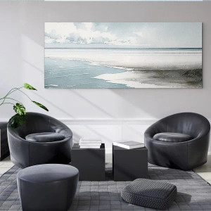 Om du letar efter en dekoration som lugnar sinnena och skapar ett utrymme för lugn, är "Gentle Tide" det perfekta valet. Detta är en horisontell målning inspirerad av naturens lugn, målad med akvarellljus, där varje nyans av blått och landskapets delikatess leder till djup avkoppling.