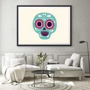 • Denna poster föreställer en färgglad dödskalle inspirerad av den mexikanska högtiden Dia de los Muertos. Ljusa, kontrasterande färger och symmetriska dekorationer skapar en unik, kulturellt relevant grafik.