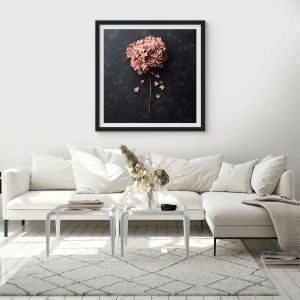- Postern avbildar en delikat torkad hortensia mot en mörk bakgrund, vilket skapar en subtil och romantisk komposition, perfekt för eleganta interiörer.