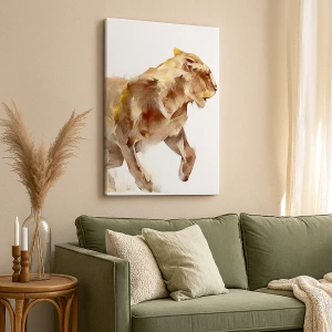 Canvastavla - Bild på duk - En springande lejoninna i en konstnärlig tolkning - 70x50cm - Vild grace - Modern väggdekoration för vardagsrum och sovrum ARTTOR