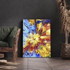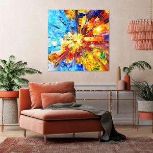 - Målningen avbildar en dynamisk explosion av färg och ljus, vilket skapar ett abstrakt mönster som flödar över av energi. De färgglada strålarna bildar geometriska former och ger verket en modern touch.