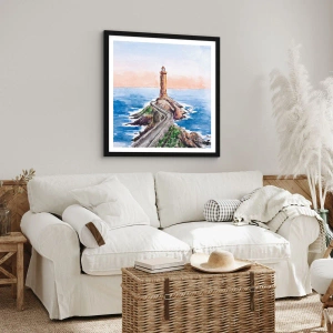 Affisch i svart ram - Akvarell illustration av en fyr på en klippig kust - 50x70cm - Vänd mot havet - Modern väggdekoration för vardagsrum och sovrum ARTTOR