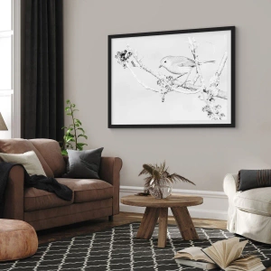 - Postern har en svartvit teckning av en fågel som sitter på en gren. Dess minimalistiska form och monokromatiska färger betonar kompositionens elegans och subtilitet och kompletterar moderna interiörer perfekt.